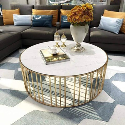 Sản phẩm đầu tiên nằm trong top 10 mẫu bàn sofa ăn khách 2020 là Bàn tròn mặt đá chân kim loại. Thân bàn được làm từ kim loại cao cấp, hạn chế rỉ sét trong quá trình sử dụng. Bên cạnh đó, thân bàn được thiết kế tinh tế với những thanh kim mỏng dọc theo mặt đất, tạo sự vững chải nhưng không kém phần tinh tế cho chiếc bàn. Ngoài ra, điều tạo nên vẻ đẹp sang trọng cho bàn là phần mặt đá. Mặt bàn được trang trí tinh tế bằng vân đá trắng nhẹ nhàng, thanh lịch. Sự kết hợp hài hòa giữa phần thân bàn vàng kim loại và mặt bàn vân đá đã đem đến vẻ ngoài đặc biệt cho chiếc bàn.